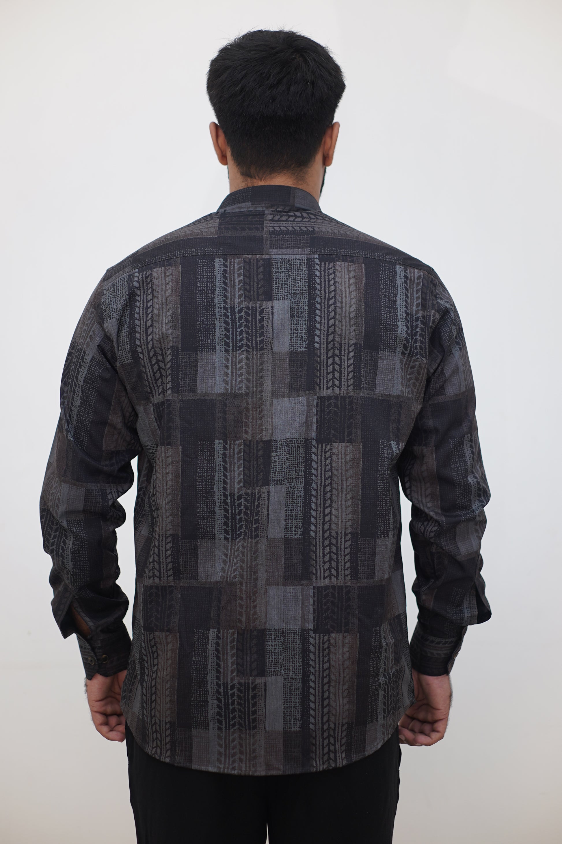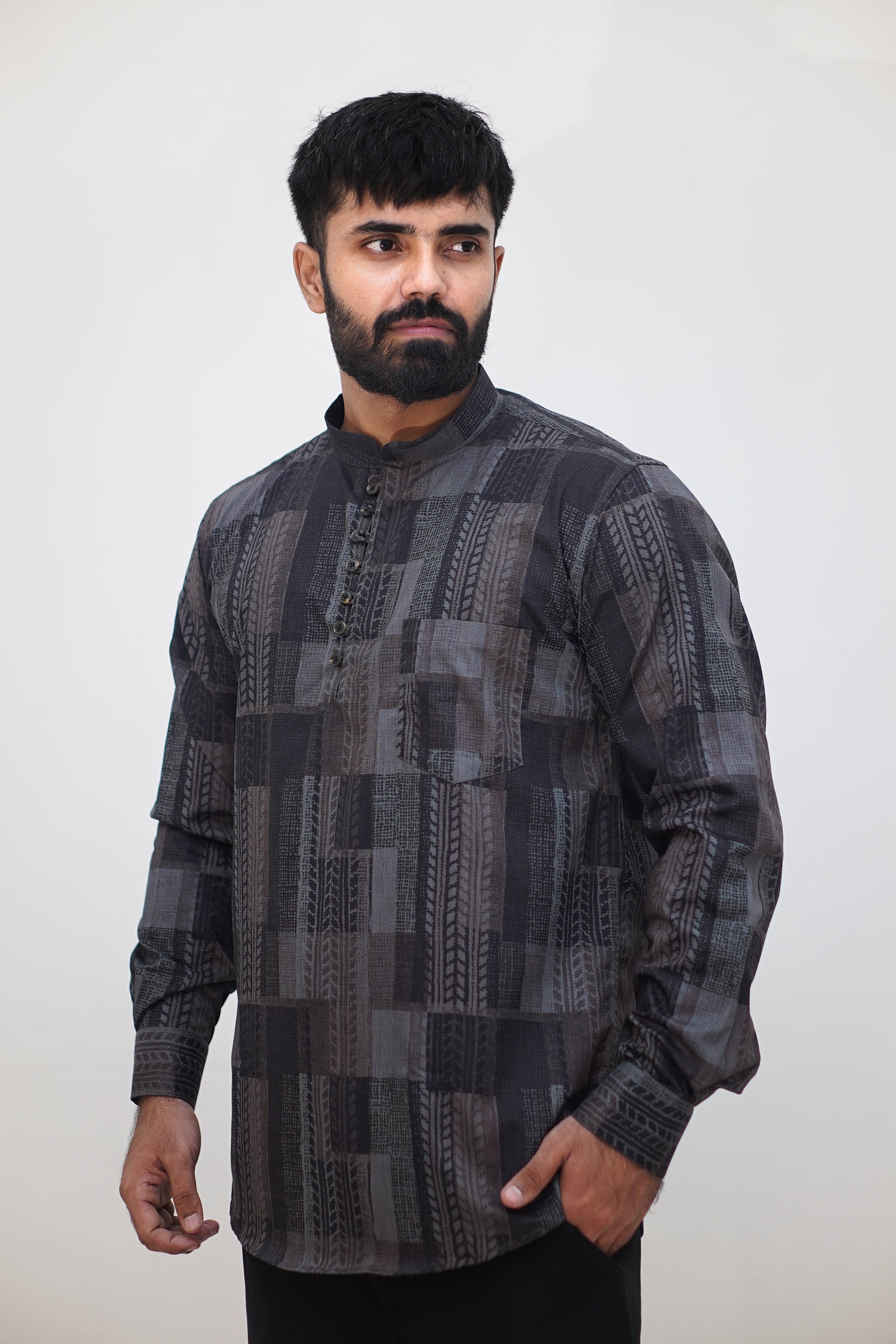 Elevate your everyday wardrobe with our Geometric Print Cotton Kurta Shirt (Regular Fit) — a breathable, lightweight piece crafted from premium cotton for comfort and style. The modern black-and-grey geometric pattern adds a bold yet versatile touch, making this shirt perfect for pairing with trousers, chinos, or denim. A timeless choice for evenings, casual office looks, or weekend outings.