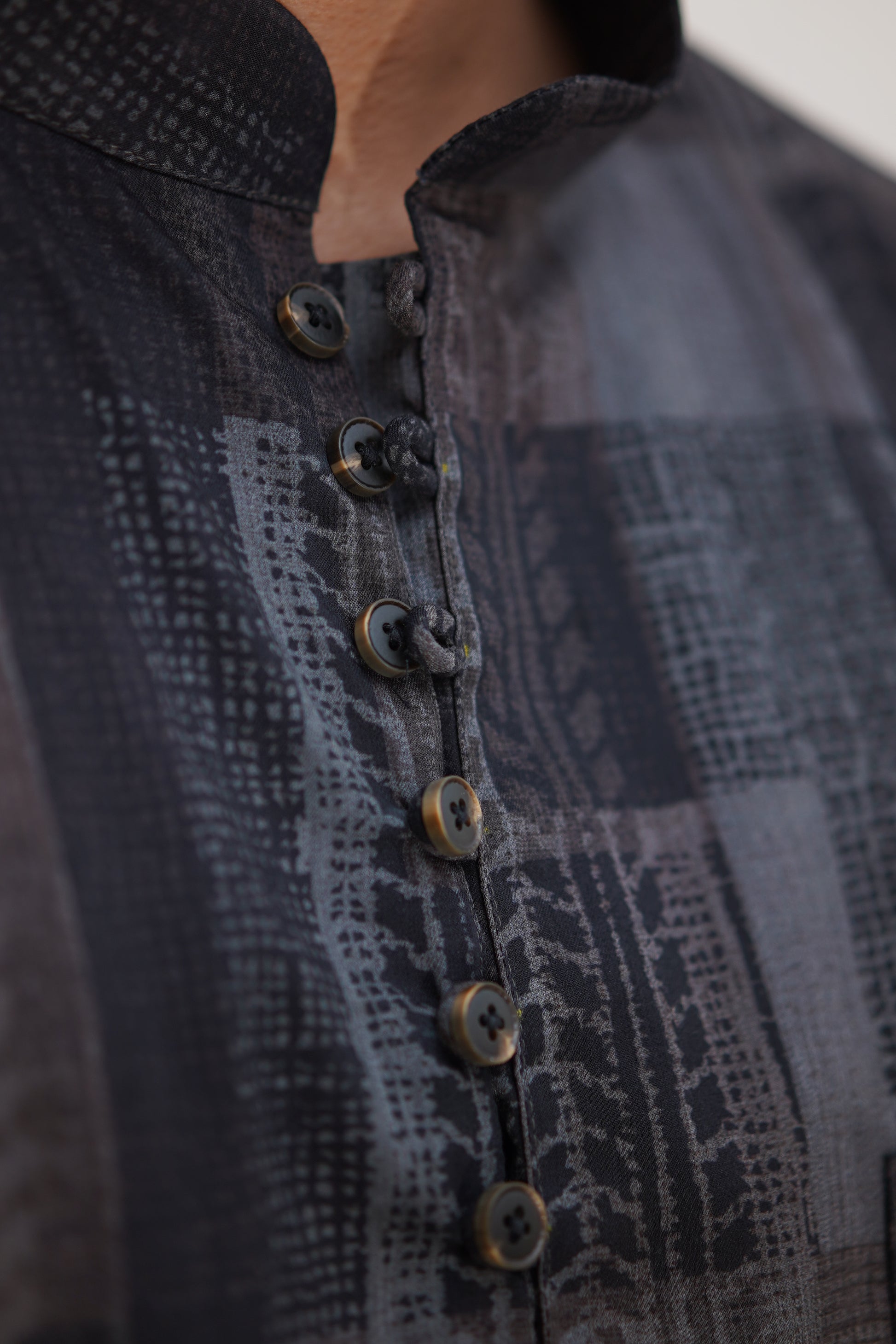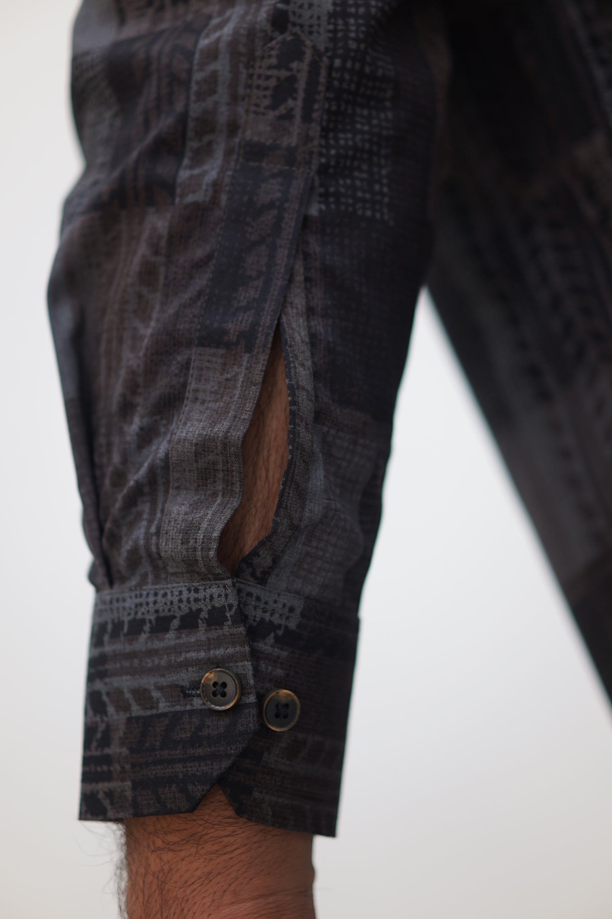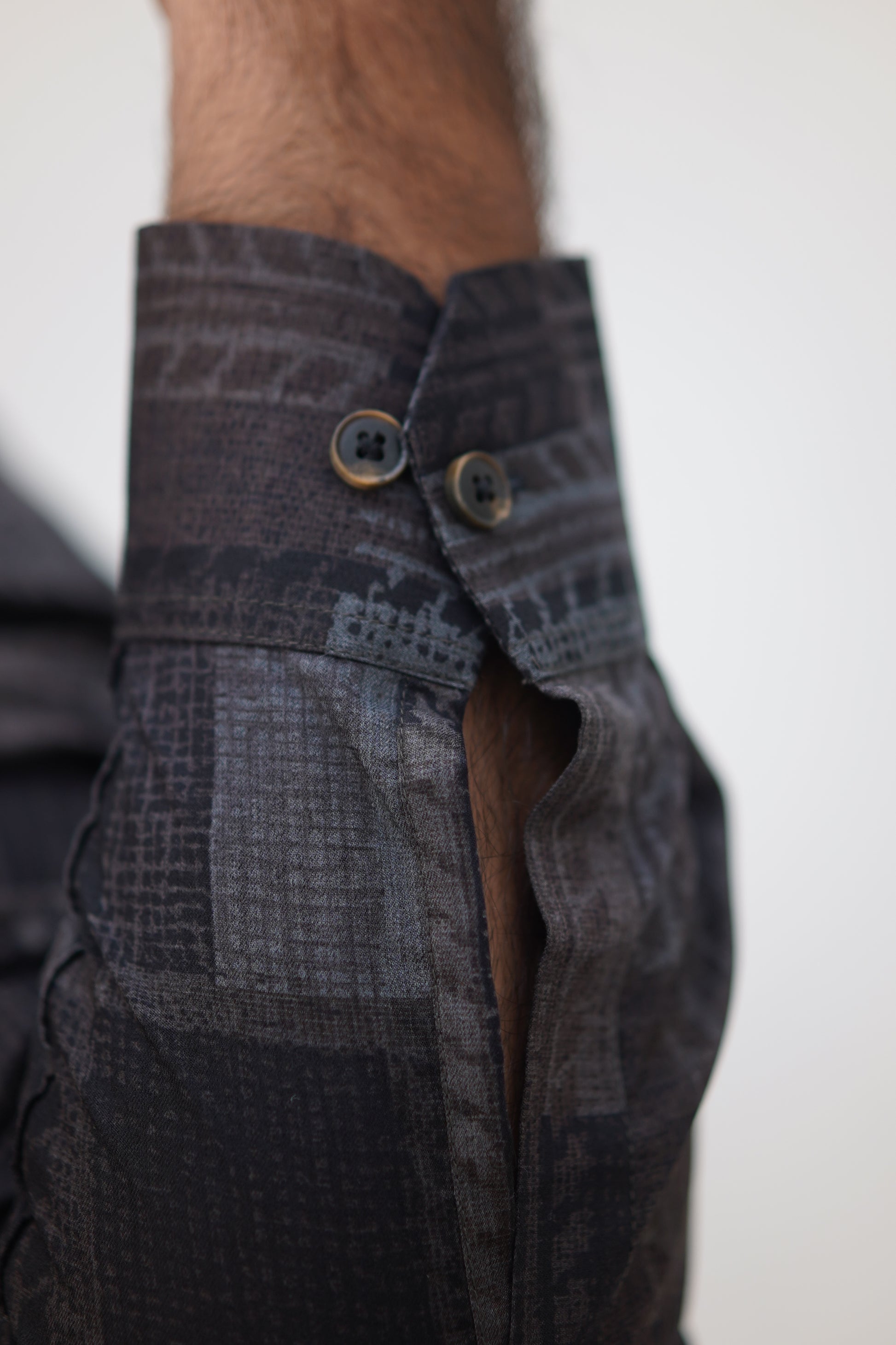 Design: Geometric black & grey print, full button placket, single chest pocket, classic collar, long sleeves with button cuffs.