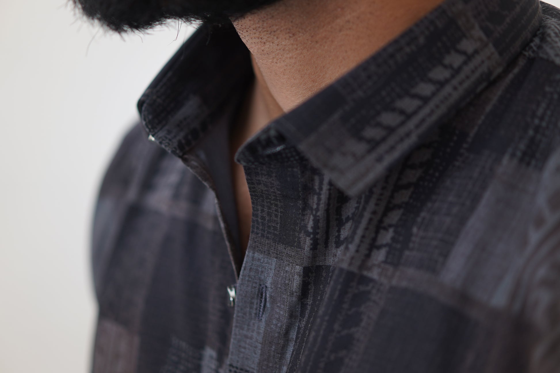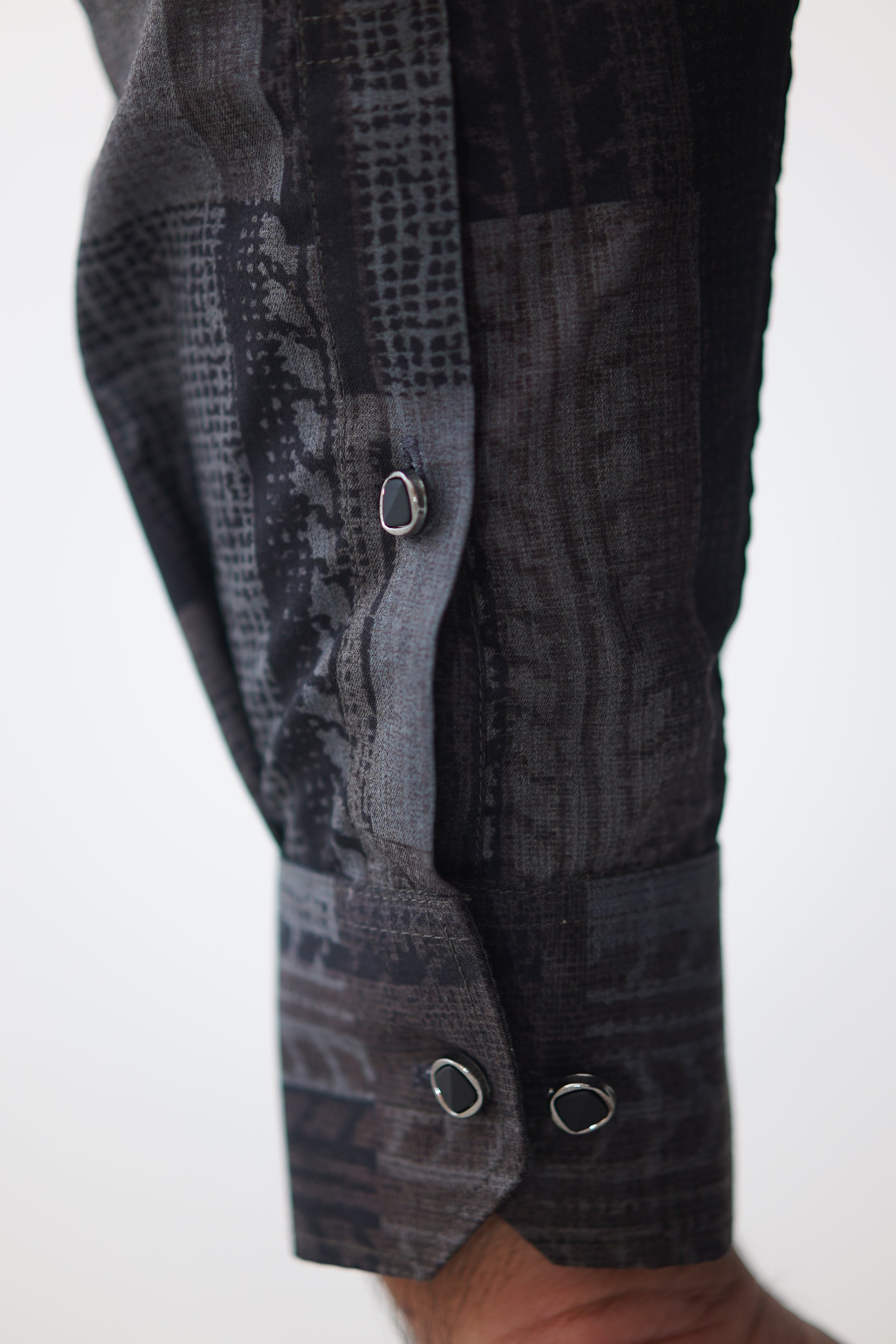 Design: Geometric black & grey print, full button placket, single chest pocket, classic collar, long sleeves with button cuffs.