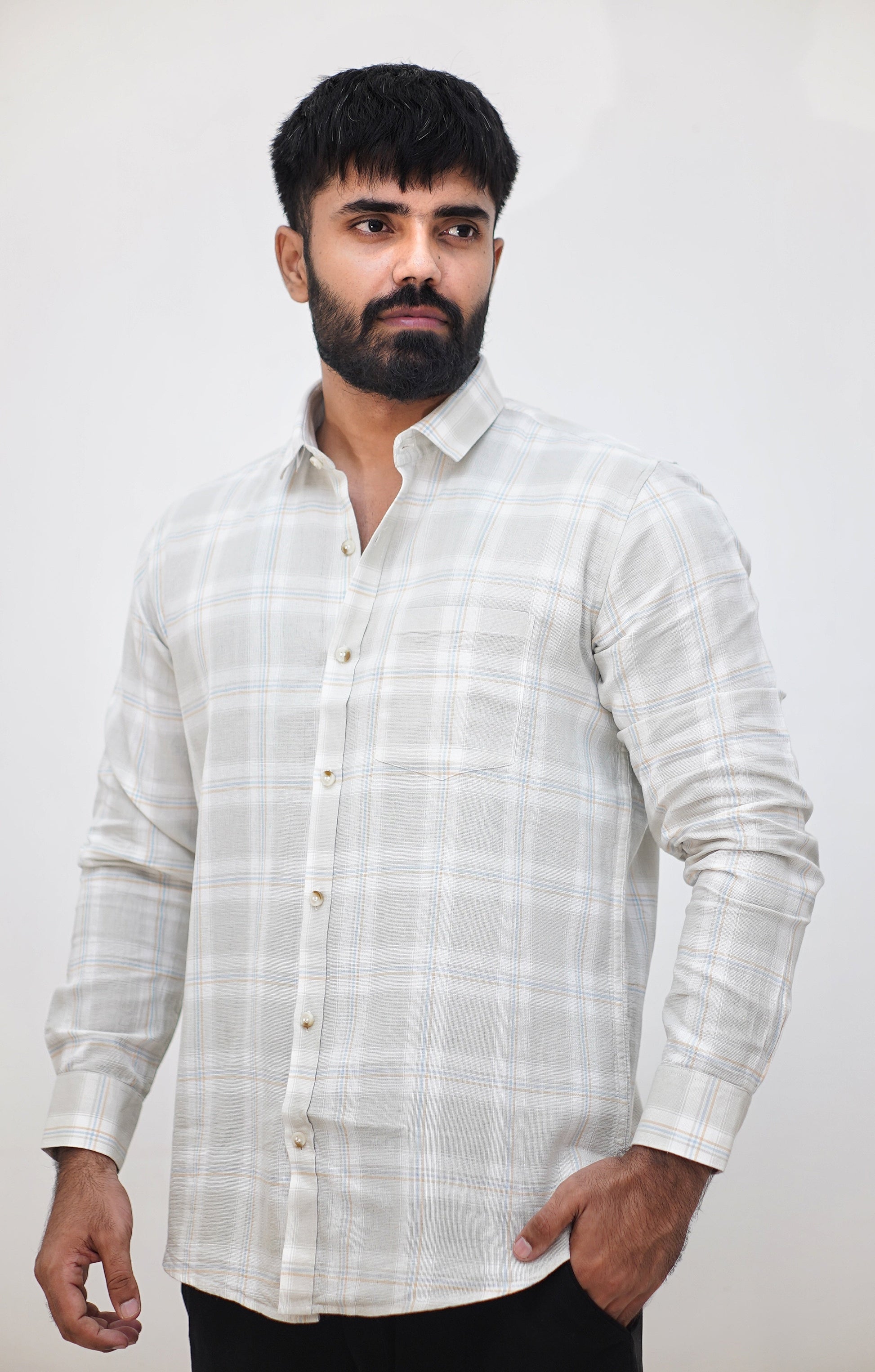 Elevate your casual wardrobe with our Sage Plaid Lightweight Modern Check Shirt (Regular Fit) — a relaxed, breathable shirt featuring a soft plaid pattern in neutral tones. Crafted from lightweight Dobby cotton, it offers excellent ventilation while the subtle checks keep the look refined. Designed for effortless styling, it pairs perfectly with trousers, jeans, or casual blazers, making it ideal for weekends, office-casual days, or travel.