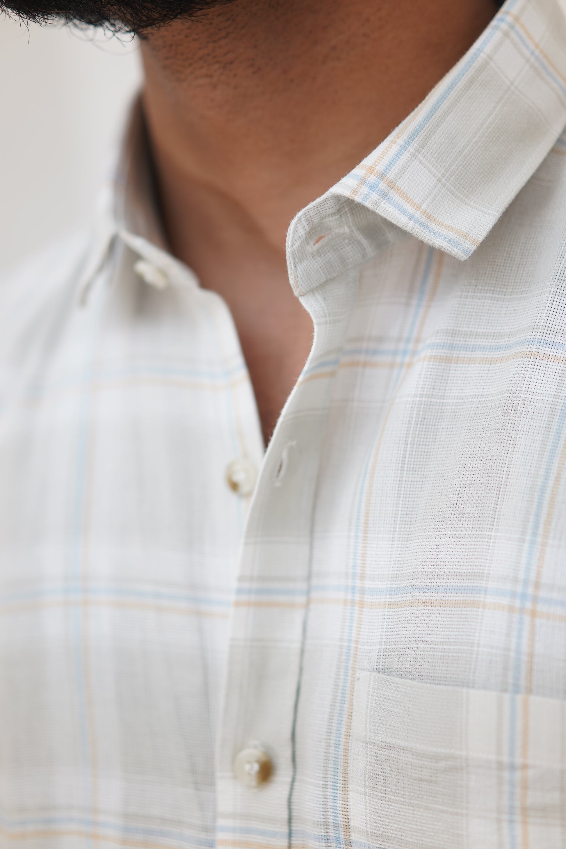 Fabric: Lightweight Dobby cotton with soft plaid print/pattern (breathable, textured finish).